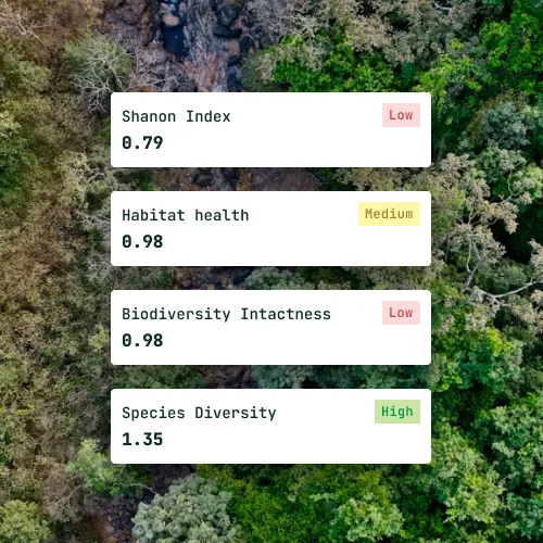 Get numerical values showing the richness and risks of the ecosystem. Eg. Biodiversity score, Human Intrusion Index, Habitat health and Species richness index.